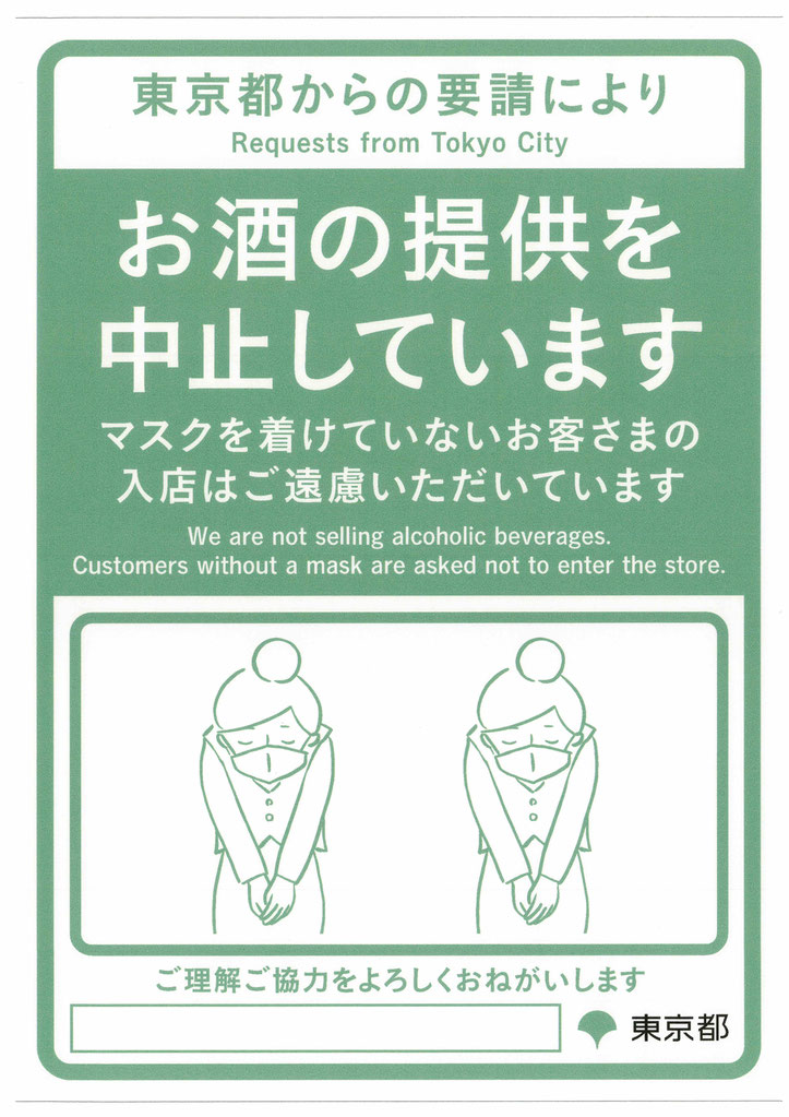 新型コロナウイルス感染拡大防止のための緊急事態措置等に伴う東京都の要請に従い、酒類の提供を終日中止し、午後8時までの時短営業とさせていただきます。